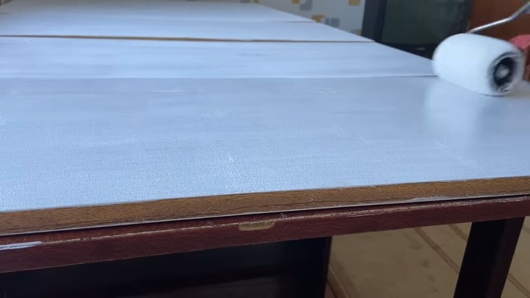 Als die Oberfläche vollkommen glatt war, konnte mit dem Streichen begonnen werden. Für die äußeren Teile des Schranks wurde eine Holzfarbe auf Leinölbasis verwendet. Schwer erreichbare Ecken wurden mit einem Pinsel gestrichen, während für die größeren, ebenen Flächen eine Farbrolle zum Einsatz kam.