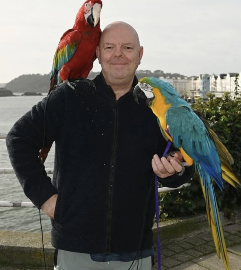 Auf dem Foto sieht Ted Richards völlig anders aus: kahlköpfig und ohne Tätowierungen, umgeben von mehreren bunten Papageien. Der Unterschied zwischen seinem früheren und seinem heutigen Aussehen ist fast unglaublich.